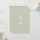 Chic e elegante. Este simples número verde da tabela de casamento apresenta um quadro branco e texto em uma fonte contemporânea. A design é repetida atrás.