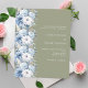 Um fundo verde sábio, decorado com flores azuis empoeiradas e brancas. Personalize e adicione seus nomes e detalhes. 1 folha = 1 convite impresso de borda a borda.