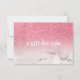 Moderno, brilhante e elegante com um toque de luxo, este cartão de presente é perfeito para muitos negócios, seja você um artista de maquiagem, cabeleireiro ou massoterapeuta, lojas de noivas, planejadores de eventos e muito mais. Com um fundo ombre glitter rosa feminino que desaparece em mármore branco e uma fonte em negrito, este estilo de cartão de visita irá conectar-se com os clientes elegantes que você está procurando. Fica incrível atualizado para papel perlado. Um design versátil para profissionais criativos e empreendedores. Adicione a redação do certificado de presente desejado e as informações de contato da sua empresa no verso.