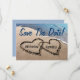 O texto "Salvar a Data!" em azul, ou mudar facilmente o texto, é adicionado a esta bela e original foto de dois corações escritos na areia ao longo da água azul do oceano para significar amor e romance. Insira facilmente o nome da noiva e noiva nos corações, como mostrado. Os nomes de exemplo são escritos no estilo de fonte e cor perfeitamente correspondentes, que também podem ser alterados facilmente. Coloque seu texto personalizado e detalhes e informações na parte traseira do convite ou deixe o vazio se desejar. Conceito de excelente para noivados de verão, casamentos, aniversários e salvamento dos convites e anúncios de data para o casal feliz.