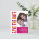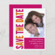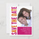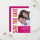 Anuncie seu futuro casamento com nossos Cartões de Anúncio Salvar a Data com um texto cor-de-rosa e cor de laranja em negrito e espaço de quadro de imagem. Basta adicionar suas informações e fotos do casamento e você está pronto para ir! Carimbos de correio e selos de envelopes disponíveis em nosso compro