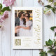 Salve a data White Dourada Na moda com Script Moderno de Casamento Moderno contém um fundo branco com sua foto personalizada. Personalize com seu texto editando o texto nas caixas de texto fornecidas e adicione o URL do seu site para o seu código QR personalizado. Projetado para você por ©Evco Studio www.zazzle.com/store/evcostudio