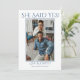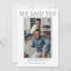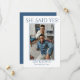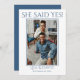 Salve o Anúncio de casamento de fotos de data projetado com sua foto favorita do casal. O texto inicial inclui: Ela disse sim!, os primeiros nomes da noiva e do noivo e a data de casamento. O texto inverso inclui: Salvar a Data e Convite Formal para Seguir. Para personalizar, simplesmente insira sua imagem em nosso modelo fácil e clique em: AJUSTADO. Certifique-se de centralizar. O texto azul permanecerá no topo. Em seguida, insira os detalhes do seu casamento no modelo passo a passo, substituindo a amostra. Se preferir, as cores do texto e do plano de fundo podem ser alteradas usando nossa Ferramenta de seleção de cores. Este Anúncio Salvar a data de casamento de fotos está disponível no impressão e no download.