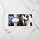 Copyright 2012 Designs da Pam. Salve a data do seu casamento com este cartão com fotos azul escuro, prateado, preto e branco brilhante. Personalize este design com sua foto favorita. Este design apresenta brilhantes globos de luz com uma fita vertical transparente e uma impressionante estrutura oval adornada com giros e folhas elegantes.