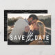 Guarde o Anúncio de Casamento de Data. Tipografia editorial moderna em texto branco sobre foto de sangria de cheio. Layout totalmente versátil do estilo do faça-você-mesmo. Ajuste facilmente o tamanho, estilo e posicionamento de todos os elementos de texto. Preto é usado para exibição, mas você pode remover ou alterar isso clicando no modo Personalizar avançado.
