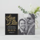 Não tradicional Guardar o postal de Casamento de Data tem um guião de ouro moderno contra um fundo preto. Sua foto em preto e branco é elogiada por este anúncio ousado.