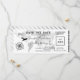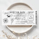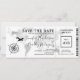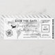 Convite de passagem de embarque para casamento salvar a data do bilhete com um elegante mapa mundial de destino em folha de prata, bússola, avião e um modelo de texto personalizado.