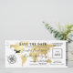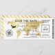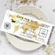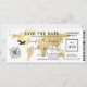 Convite de cartão de embarque para casamento ou de salve a data com um elegante mapa mundial de destino com folha de ouro, bússola, avião e um modelo de texto personalizado.