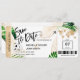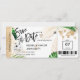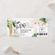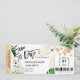 Cartão de embarque de destino para casamento e salve a data na praia dourado coração e ícone de avião e folhas tropicais