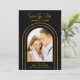 Salve a data: Cartões de Casamento Dourados de Arte com Script de Na moda Preto apresentam seu dentro de fotografia favorito em um fundo preto. Personalize com seu texto editando o texto nas caixas de texto fornecidas. Projetado para você por ©Evco Studio www.zazzle.com/store/evcostudio