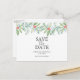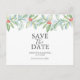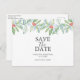 Este casamento de Natal salvou os cartões postais de data... com uma barqueira elegante de cor d'água, verde de inverno. As palavras "Salvar a Data" são digitadas em cinzas de carvão sobre um fundo branco nítido. Use os campos modelo para adicionar suas informações personalizadas. Para ver mais as datas e o tema completo do casamento, visite www.zazzle.com/dotellabelle Arte e design de folhagem verde-aquática exclusiva de Victoria Grigaliunas. Para mais informações, procure-me uma mensagem para mais informações.