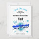Uma festa de aniversário infantil que você pode personalizar usando o recurso "personalizar este modelo" à direita. Tipografia legal azul e preta sobre fundo branco com gráfico divertido azul claro. Todos os detalhes podem ser inseridos no verso.