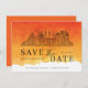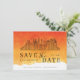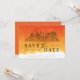 Esta moderna placa Save the Date apresenta um desenho de linha do Skyline de São Francisco, incluindo a ponte Ouro Gate. O fundo tem uma textura aquosa em tons de vermelho e laranja que lembra o pôr do sol. Este cartão é perfeito para nativos ou amantes de São Francisco. É ideal para um casamento de destino ser celebrado em São Francisco, Califórnia.