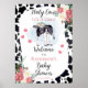 "Santa Vaca, É uma Rapariga!" holstein Chá de fraldas de vitelo preto e branco de vaca, apresentando flores cor-de-rosa e brancas e um fundo de vacas preto e branco. O bezerro doce está a fazer um buquê floral sobre a cabeça. Design composto por Designs Holiday Hearts.