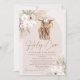 Santa Vaca Floral Boho Arch Invitation Bohemian inspirou um convite de chá de fraldas com dois arranjos florais com grama pampas, uma imagem de caligrafia moderna e um arco cor de pincel e uma vaca e bezerro nas terras altas. Este moderno convite para chás de fraldas de vacas sagradas florais boêmicas é ideal para qualquer um que tenha um chá de fraldas inspirado por uma menina.