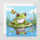 Placa de vazio com tema de sapo. Um sapo ou sapo adorável sentado sobre uma almofada de lírios cercado por borboletas com seu reflexo na água. Sapo de desenho animado no estilo dos quadrinhos.