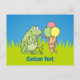 Sapo sorridente rouba um cone de sorvete com a língua. Texto personalizado.
