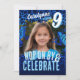 Prepare-se para se divertir! Esta festa de aniversário da floresta tropical comemora um 9º aniversário muito especial com sapos vibrantes de dardos venenosos azuis e padrões ousados. Personalize facilmente este design com sua própria foto, nome e detalhes.