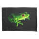 Um sapo verde fraturado com olhos laranja ferozes contra fundo preto.