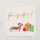 Cartão de saudação de Natal ou Feriado Brilhante com um cão Tan Dachshund num chapéu de Papai Noel e presentes coloridos. Mude facilmente as informações para as suas. Saudações sazonais divertidas e brilhantes.