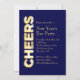 "Cheers" escrito em luzes marqueadas antigas em um fundo azul escuro, acentua o Convite de festas da véspera de Ano Novo, dando-lhe uma aparência divertida e moderna.