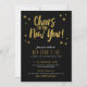 convite de festas de Ano Novo "Saúde ao Ano Novo", em ouro brilhante, em fundo negro. Este convite apresenta uma bela fonte de script e estrelas douradas. Pronto para personalizar com seus detalhes para que seus amigos e familiares saibam sobre seu evento!