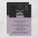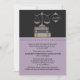 Este convite/anúncio de escola de direito preto e mauve apresenta a escala de justiça em cima de três livros e um ótimo filme para um monograma. Um design perfeito para um formando de direito ou um convite de um escritório de advocacia.