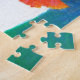 Um quebra-cabeça de serra com um vaso branco de papoilas orientais brilhantes em um fundo azul escuro, de uma pintura de pastel de óleo feita por Judy Adamson.