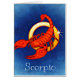 Cartão de saudação plano com ilustração colorida apresenta fundo azul com um escorpião vermelho - o símbolo do sinal zodiaco astrológico Scorpio (23 de outubro-21 de novembro).