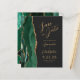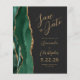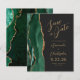 A borda esquerda deste elegante casamento moderno salve o cartão de data apresenta uma esmeralda verde aquarela agate borda com falsa brilho dourado. O texto personalizável combina o script dourado e as fontes sans serif em um fundo preto de slate. O verso apresenta um design verde e dourado correspondente.