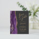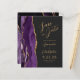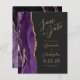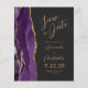 A borda esquerda deste elegante casamento moderno salve o cartão de data apresenta uma borda de agata púrpura aparada com falso brilho dourado. O texto personalizável combina o script dourado e as fontes sans serif em um fundo preto de slate. O verso apresenta um design de agate roxo e dourado correspondente.