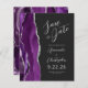 A borda esquerda deste elegante casamento moderno salve o cartão de data apresenta uma coloração d'água roxa com borda fina de prata. O texto personalizável combina o script de cinza prateada e as fontes sans serif em um fundo preto de slate. O verso apresenta um design de agata prateado e roxo correspondente.