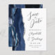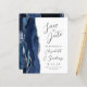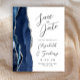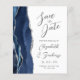 A borda esquerda deste elegante casamento moderno salve o cartão de data apresenta uma marinho azul de aquarela agata borda com falso brilho prateado. O texto personalizável combina a escrita manual de cinzas de carvão, as fontes em copperplate e itálico em um fundo branco. O verso apresenta um marinho e um design prateado correspondentes.