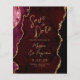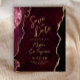 Este casamento elegante salve o cartão de data mostra uma imagem de fundo da cor vermelha da lama de burgundy, cortada com falso brilho dourado. O texto personalizável combina manuscrito, protetor e fontes itálicas de cor dourada. O verso apresenta um design de burgundy coordenadora e de ouro agate.