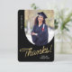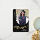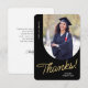 Este cartão de agradecimento de graduado plano apresenta uma foto vertical com uma borda arqueada. Personalize este cartão preto e dourado com sua própria mensagem ou use a mostrada.