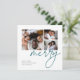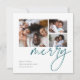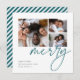 Compartilhe alegria com esses cartões de natal coloridos e modernos, com 3 de suas fotos favoritas (um quadrado e duas pequenas horizontais ou paisagens orientadas). A "Feliz" aparece em um roteiro casual, moderno, escrito à mão, em uma bela joia de tom teal. Personalize com seu cartões de natal personalizado, seu nome de família e o ano na base. Uma escolha de olhar em forma quadrada única e arredondada para as suas saudações de Natal de 2021.