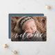 Um design de anúncio de nascimento doce e elegante que apresenta um cheio sangrando fotos horizontais ou paisagísticas com "boas-vindas" sobrepostas em caracteres de escrita de caligrafia branca. O nome do seu bebê e as estatísticas de natalidade aparecem abaixo. Adicione três fotos quadradas adicionais às costas, juntamente com uma mensagem pessoal.