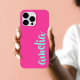 Cobrir de telefone cor-de-rosa com seu nome em uma fonte de script azul aqua em um fundo rosa quente. Design de cor e cor.