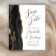 A borda esquerda deste elegante casamento moderno salve o cartão de data apresenta uma borda de agata preta aparada com falso brilho dourado. O texto personalizável combina a escrita manual de cinzas de carvão, as fontes em copperplate e itálico em um fundo branco. O verso apresenta um design de agate preto e dourado correspondente.