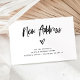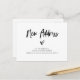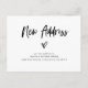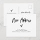 Estes cartões postais de anúncio em movimento a preto e branco apresentam um roteiro casual moderno que diz "novo endereço", juntamente com um coração desenhado à mão. Há mais espaço no verso para adicionar notas adicionais. Um design simples e chique que é a maneira perfeita de deixar amigos e familiares saberem que vocês se mudaram.