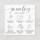 Placa moderna de assistência a joias com letra de escrita elegante e ícones de assistência a joias. Este número mínimo de placas de inserção de butique de joias brancas e pretas inclui as informações mais importantes sobre joalharia, bem como uma nota de agradecimento no verso com espaço para seu logotipo e detalhes comerciais. Você pode editar todas as cores, remover ícones de mídia social e fazer com que essas placas sejam personalizadas. A adição perfeita ao seu design de embalagem. Podem ser utilizadas como instruções de cuidado para brincos, colares, anéis, pulseiras ou qualquer outra joia.