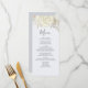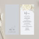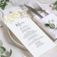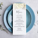 Este design apresenta um elegante e simples cartão de cardápio de casamento, com um roteiro de caligrafia, rosa branca e verde floral, com um fundo azul claro, o decoro perfeito.