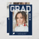Os Convites para Script Moderno Elegante para Festa de formatura de Fotografias apresentam a sua foto favorita com o simples texto branco "Formando (ano)" e o seu nome e detalhes personalizados de graduação na frente, em um fundo azul. No verso, adicione uma imagem adicional com as informações de seu convite de graduação abaixo. Personalize editando o texto nas caixas de texto fornecidas. Criado por ©Evco Studio www.zazzle.com/store/evcostudio