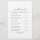 Este guião moderno Encontrar O cartão de casamento de Convidado é perfeito para uma recepção de casamento minimalista. O simples design preto e branco apresenta uma tipografia industrial única, com estilo boho moderno. Personalizável em qualquer cor. Mantenha o design mínimo e elegante, como está, ou personalize-o adicionando seus próprios gráficos e trabalhos de arte. Personalize o cartão com os nomes da noiva e do noivo e a data do casamento. Você pode personalizar as perguntas do jogo clicando no botão "personalizar".