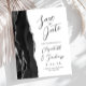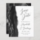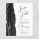 A borda esquerda deste elegante casamento moderno salve o cartão de data apresenta uma coloração d'água preta aparada com falso brilho prateado. O texto personalizável combina a escrita manual de cinzas de carvão, as fontes em copperplate e itálico em um fundo branco. O verso apresenta um design de agata preto e prateado correspondente.