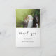 Cartão de agradecimento de casamento simples com letra manuscrita preta. Adicione sua foto de casamento no interior. Elke Clarke © Envie sua mensagem de agradecimento de casamento como recém-casados aos seus amigos e familiares usando este elegante e memorável cartão de agradecimento de casamento com as palavras "obrigado" escritas em uma sobreposição de texto de tipologia de escrita manual preta. Adicione sua mensagem pessoal de agradecimento no interior ou deixe em branco e escreva sua mensagem à mão pessoalmente. Outras cores disponíveis