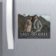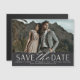 Uma imã salve a data moderna projetada para acomodar uma fotografia de noivado horizontal ou orientada para a paisagem. "Salvar a data" aparece abaixo em letras de chic block e script, com seus nomes, data de casamento e local de casamento embaixo, junto com seu site de casamento ou detalhes adicionais.