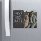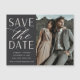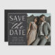 Uma imã salve a data moderna projetada para acomodar sua foto favorita de noivado vertical ou orientada a retratos. "Salve a data" aparece ao lado da sua foto no bloco chic e na escrita, com seus nomes, data de casamento e local do casamento embaixo.