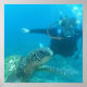 Scuba mergulhando debaixo d'água com tartaruga marinha grande.