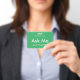 Crachás verdes e brilhantes do tipo "Pergunte-me" para voluntários, professores, centavos, guias, organizadores de eventos para eventos especiais, como casamentos, feiras de artesanatos, shows de casas e jardins, eventos de caridade, funções empresariais e corporativas. A cor da tipografia é marfim pálido que dá a este crachá uma aparência moderna.